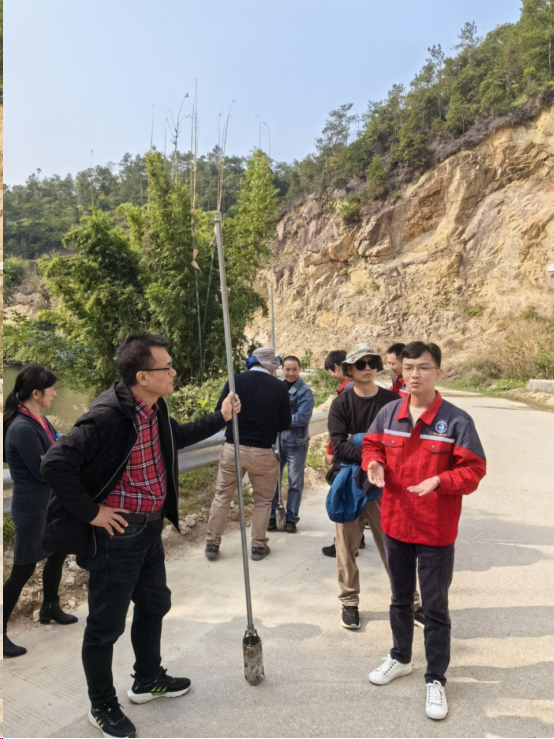 11月25日上午,在江西地质七队杨斌和李家桢两位稀土矿项目负责人的陪同下,酷爱成人网 教师调研了赣县夏湖重稀土矿区,考察了夏湖离子吸附型重稀土矿的花岗岩风化壳剖面。杨斌同志详细介绍了夏湖离子吸附型稀土矿床的地质特征和勘查找矿历史,随后两位负责人同志演示了离子吸附型稀土矿的勘查技术方法以及七队独立研发的新型勘查工具——赣南钻的使用方法。老师们对该类型稀土矿的成矿机理、赋存机制及勘查技术展开了热烈的讨论,并纷纷尝试利用赣南钻开展风化壳野外取样工作。