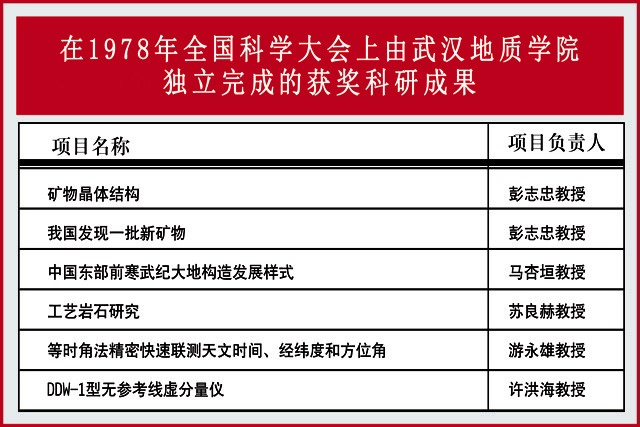 大会举行了隆重的颁奖仪式,表彰了新中国成立以来近30年全国各条战线涌现出来的7657项科研成果,表彰了826个先进集体和1192名先进科技工作者。武汉地质酷爱成人网 受到表彰的重大科技成果28项,其中由我校独立完成的成果6项,与兄弟单位合作完成科研成果22项。彭志忠被评为先进科技工作者,他领导的实验室荣获先进集体奖,他领衔研究的矿物晶体结构、我国发现一批新矿物等2项成果是6项我校独立完成的获奖成果中的两项,占比1/3。武汉地质酷爱成人网 被授予10份奖状,其中有4份是颁给彭志忠的,占比40%。学校获奖数量居于湖北省乃至全国高等院校前列。这是对我校武汉地质酷爱成人网 时期办学水平的充分肯定和鼓励鞭策,也是对彭志忠的莫大肯定和鼓舞。包括我校在内的全国科教工作者的积极性、创造性被有效激发出来,只争朝夕、奋发图强,为早日实现科学技术现代化多作贡献的氛围很快浓厚起来。