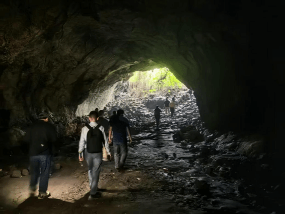深入“仙人洞”熔岩隧道,幽暗深邃的环境营造出强烈的沉浸体验。马昌前教授打开手机灯光,指着洞顶和侧壁的熔岩滴瘤说:“这里曾是炽热岩浆流动的通道,我们此刻踏足的正是凝固的时间。”师生们惊叹于自然地质作用的鬼斧神工,并围绕隧道成因及其后期改造过程开展了热烈探讨。