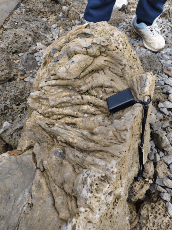 木兰湾的变质岩考察将“导学共研”推向高潮。在海风凛冽的基岩海岸,现场演变为一个开放的学术研讨平台。李益龙老师引导大家关注片麻理构造现象,刘嵘老师则从矿物组合的微观特征进行补充阐释。随行的地质局专家结合区域勘探实践经验,系统介绍了宏观地质背景和当前研究程度。师生与产业专家围绕“海南岛构造单元划分和演化”开展了深入讨论,不同学术观点在海浪拍岸声中激烈交锋,地学知识在共享与互动中得以有效建构与深度内化。