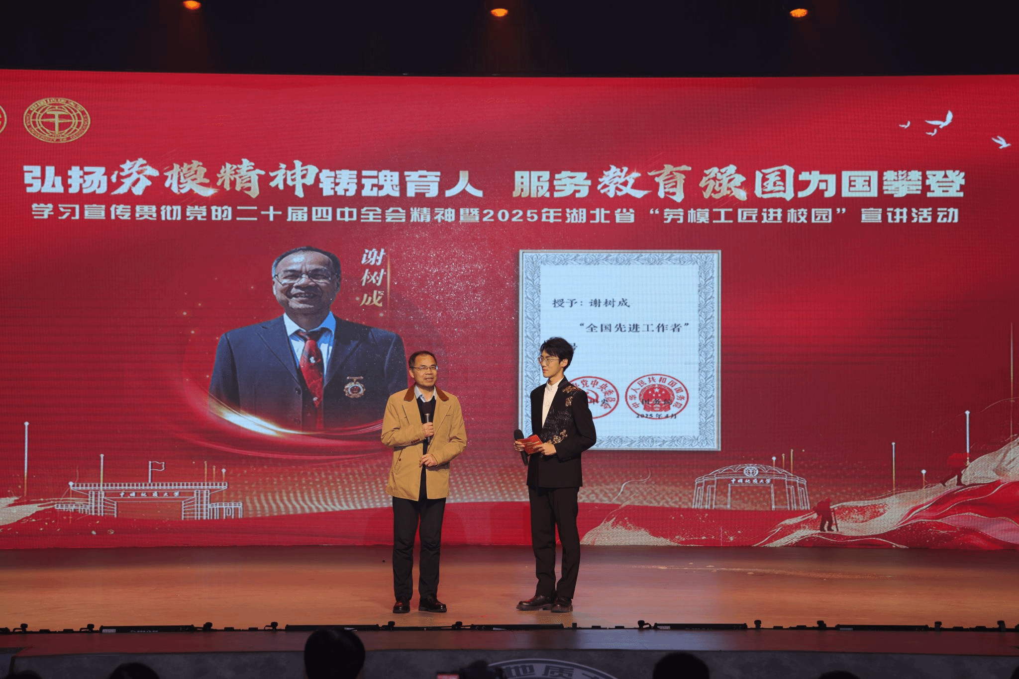 谢树成院士荣获“全国先进工作者”,根据其事迹创编的情景剧《攀登》作为湖北省总工会主办的学习宣传贯彻党的二十届四中全会精神暨2025年湖北省“劳模工匠进校园”重要内容在多所高校演出。汪在聪教授荣获首届“腾冲青年科学家奖”提名奖。8位教授入选“中国高被引学者”,16人跻身全球前2%顶尖科学家榜单,新增楚天学者1人,新增湖北省卓越研究群体1个、湖北省创新研究群体1个。师资影响力持续提升。