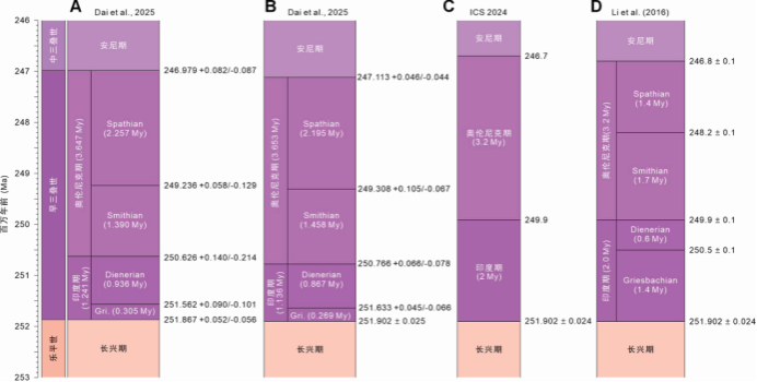 早三叠世(距今约2.52至2.47亿年)是地球演化历史中的关键时期之一,其处于显生宙最大的生物灭绝事件之后,是生物从残存到复苏的关键时期,同时也是现代类型海洋生态系统崛起的关键时间。此外,早三叠世还伴随着异常的碳循环波动,多次极端高温事件、海洋缺氧事件和酸化事件等。一条可靠的高精度地质时间轴对限定这一系列的生物事件和环境事件发生的时间和速率至关重要。然而,不同方法给出的早三叠世的年代地层框架存在较大争议,如旋回地层估算的印度期的持续时间为1.2、1.6 或2.2百万年。部分早三叠世亚期的界线还缺乏精确时间,如Griesbachian-Dienerian界线。